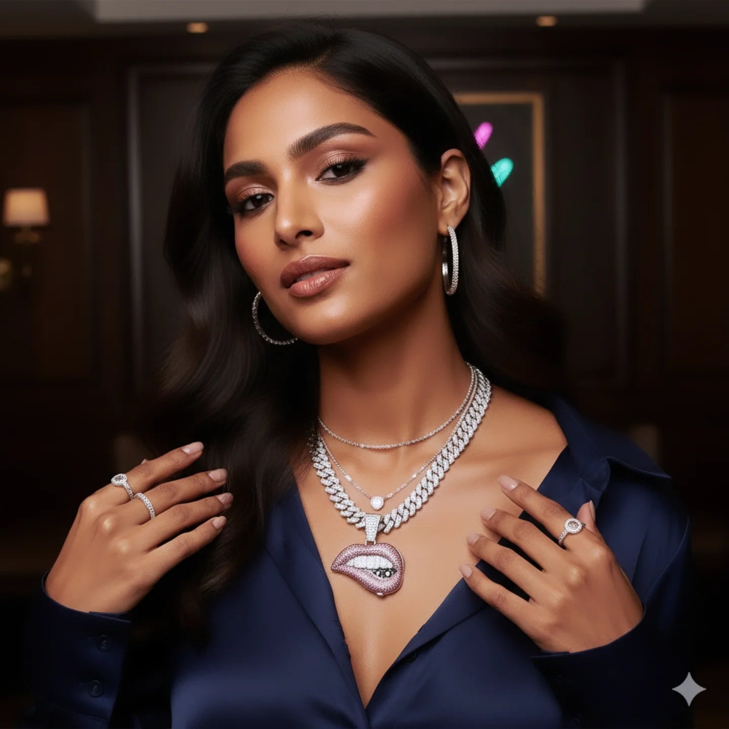 Elevate your look with our Icy Lip chain. This crystal lip necklace adds a touch of elegance and sparkle to any outfit. Stand out and make a statement with this unique piece that will surely catch the eye. Perfect for any fashion-forward individual.